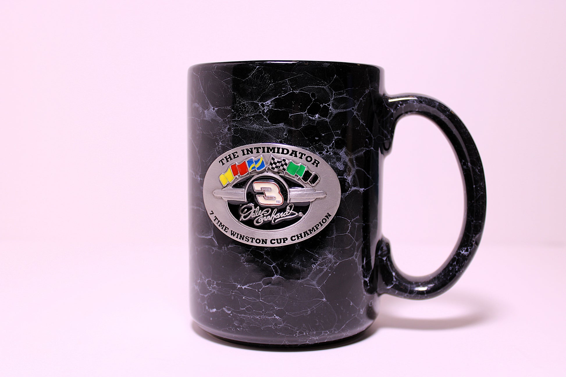 Dale Earnhardt inspired black mug featuring "the intimidator" and "7-time champion' inscriptions.