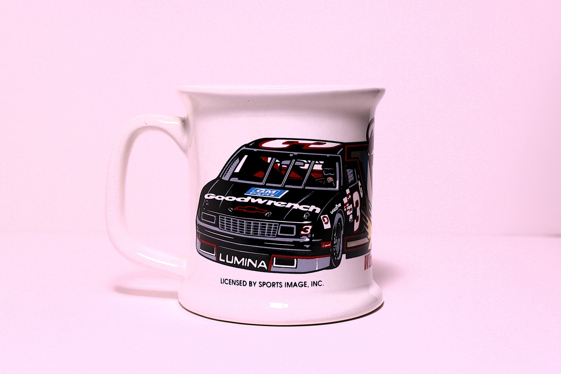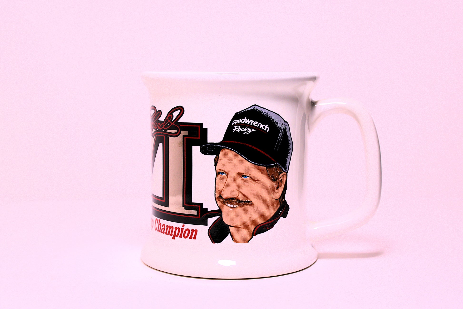 White mug featuring Dale Earnhardt commemorating his Winston cup achievements.
